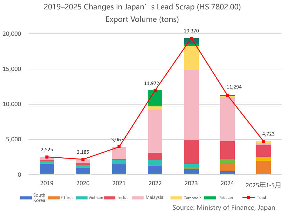 日本的废铅(铅渣)出口趋势显示,由于巢铅受到出口限制,许多废铅以“铅渣”的形式进行出口。此前,马来西亚是主要的进口国,但自2024年夏季马来西亚加强了进口限制后,已停止从日本进口铅渣。这一变化导致日本的铅渣出口量急剧下降。