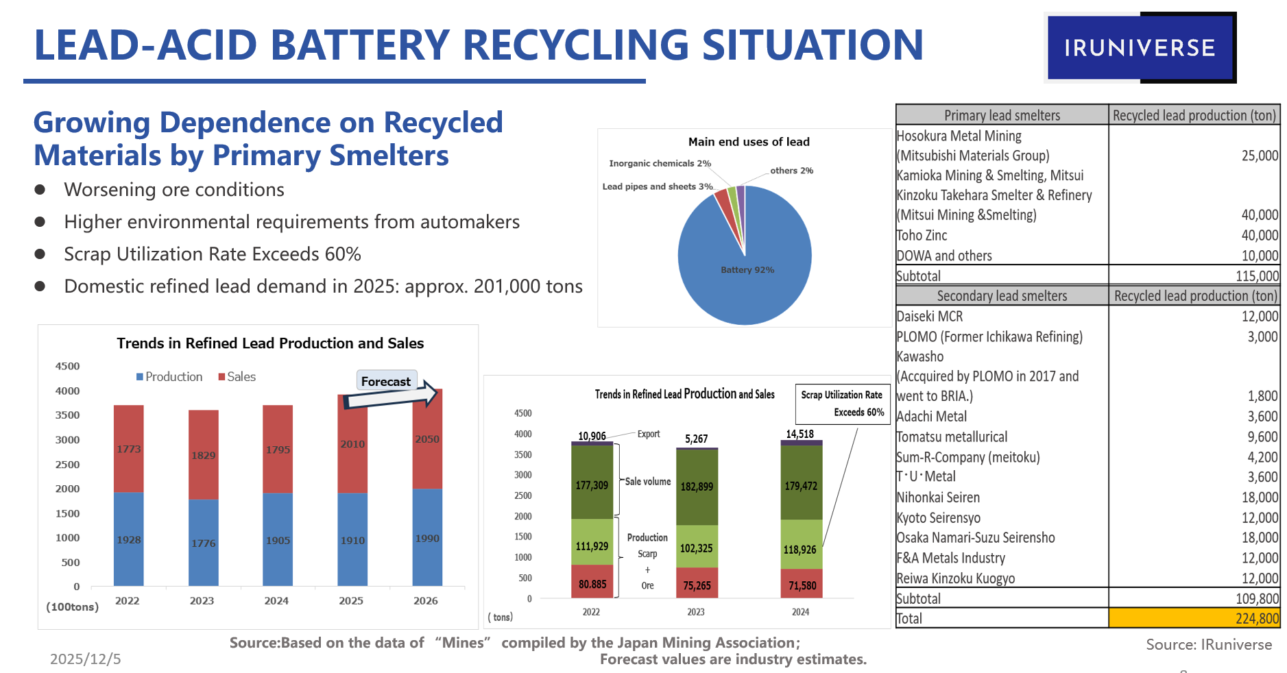 与此同时,在全球推动碳中和与循环经济的大背景下,日本的一次铅冶炼厂正致力于增加回收材料在其生产过程中的比例。这一趋势使得日本企业与中国同行之间围绕废料收集的竞争日益激烈,尤其是在那些以出口为目的而进行采购的中国企业面前。